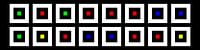 Centraal geplaatste vierkante stroken, matrix 08x02, aantal nesten N=2, Willekeurig #09, middens rood, groen, blauw, geel