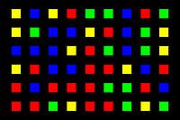 Centraal gerangschikte vierkante stroken, matrix 09x06, aantal nesten N=1, willekeurig #04, middens rood, groen, blauw, geel