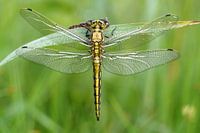 Deze libel was net uitgesloten en zat al een tijdje op te drogen. Zijn vleugels waren al uitgeklapt. Bovenop de grasspriet kun je zijn cocon nog zien. Genomen te Roosendaal.