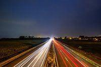 Net voor de onweersstorm in augustus, de eerste bliksemschicht is al te zien in de verte, een lange sluitertijd opname boven de snelweg.