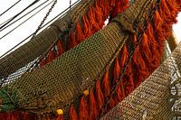 Detail van de netten van een vissersboot, op Texel. Aan de netten hangen bosjes rood touw en ook zijn er roestige kettingen te zien. Het beeld bevat veel diagonale lijnen.