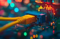 De verbinding tussen technologie en creativiteit ontvouwt zich in een spannend samenspel van licht en kleur. De gloeiende LED's en opvallende gele netwerkkabel creëren een futuristische sfeer. Dit beeld is ideaal voor een modern kantoor en inspireert tot innovatie en samenwerking. Een echte blikvanger voor liefhebbers van technologie!