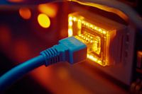 In een fascinerend samenspel van licht en technologie versmelt de verlichte netwerkaansluiting met de elektriserende blauwe kabel die wacht om aangesloten te worden. De warme, gouden tinten geven elke ruimte een moderne flair. Perfect voor een kantoor waar technologie en creativiteit hand in hand gaan.