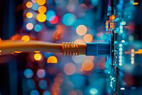 Een fascinerende combinatie van technologie en licht ontvouwt zich in deze foto. Heldere kleuren en de prachtig geënsceneerde ethernetverbinding trekken onmiddellijk de aandacht. Ideaal voor een modern kantoor of creatieve werkruimte, het brengt dynamische energie en inspireert tot innovatief denken.