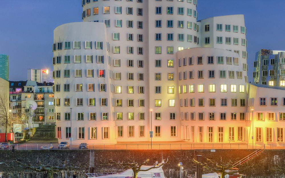Zur blauen Stunde haben die Gehry-Bauten am Neuen Zollhof in Düsseldorf ihren ganz eigenen Charme.