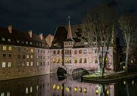 Deze foto toont een prachtig nachtbeeld van een historisch gebouw in Neurenberg, Duitsland. Het gebouw is sfeervol verlicht, en de verlichting weerspiegelt op het rustige water van de rivier of gracht die eronder doorloopt. De architectuur combineert middeleeuwse en renaissancestijlen, met een opvallende centrale toren en bogen die verschillende delen van de structuur verbinden.