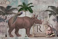 Imposante neushoorn met een aap, fantasierijke collage met vintage ephemera en decoratieve elementen
