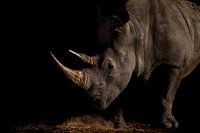 We kijken de neushoorn recht in z'n ogen. Deze rhino, een vrouwtje, blaast lucht uit haar neusgaten en het stof dwarrelt van de grond omhoog russen het droge gras. De huid van de neushoorn is gerimpeld, grijs en bruin. Het is een witte neushoorn die je herkent aan de rechte, brede onderlip. De achtergrond van deze neushoornfoto is zwart gemaakt waardoor de twee puntige hoorns scherp afsteken. De brede poten van de neushoorn heeft drie tenen en in deze foto zie je de voorpoten uit de donkere achtergrond opdoemen. Het gras is goudgeel en de savanne stoffig. Deze foto is genomen bij de Waterberg in Namibië, een private game reserve met vijf neushoorns die je lopend of per auto kan gaan zoeken. Je kan dan heel dichtbij de neushoorns komen!