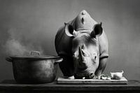 Een charmant stilleven waarin een artistiek vormgegeven neushoorn wordt gecombineerd met een dampende kookpot. De contrasten tussen het ruwe materiaal en het gebogen lichaam van het dier creëren een spannende sfeer. Perfect voor in de keuken om te inspireren tot creatieve kookavonturen en een vleugje humor.
