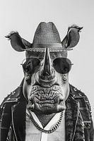 Een creatief portret van een neushoorn in modieuze kleding, zoals een hoed en zonnebril. Perfecte stijl in zwart-wit.