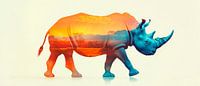 Een majestueuze neushoorn in combinatie met een adembenemende zonsondergang wekt de indruk van vrijheid en avontuur. De harmonieuze oranje en blauwe tinten creëren een rustgevende sfeer. Dit kunstwerk is ideaal voor in de woonkamer, waar het gesprekken kan stimuleren en de verbeelding kan inspireren.