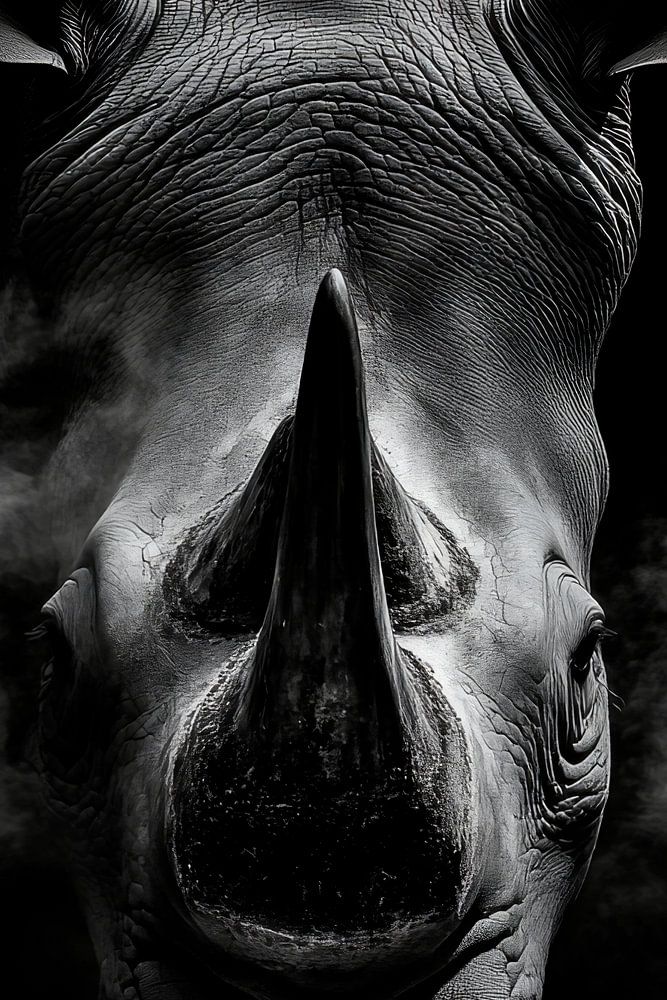 Een majestueuze neushoorn met een krachtige uitdrukking en indrukwekkende hoorn trekt ieders aandacht. De mysterieuze, donkere achtergrond draagt bij aan het drama en geeft een gevoel van kracht. Deze opvallende muurschildering zou een boeiend hoogtepunt zijn in de woonkamer, een gesprek stimuleren en een spannende sfeer creëren.