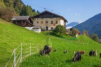 Geiten grazen op de weide voor een boerderij, Neustift im Stubaital, Stubaital, Stubai, Tirol, Oostenrijk