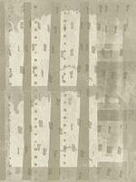 Collage van verschillende texturen, penseelstreken, monotypes in een neutraal, gedempt en retro geïnspireerd kleurenpalet.
