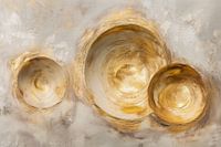 Een subtiel abstract schilderij waarin zachte beige tinten de basis vormen. De cirkelvormige structuren met gouden nuances geven warmte en elegantie, zonder de rust te doorbreken. Dit werk voegt een serene en verfijnde sfeer toe aan elk interieur.