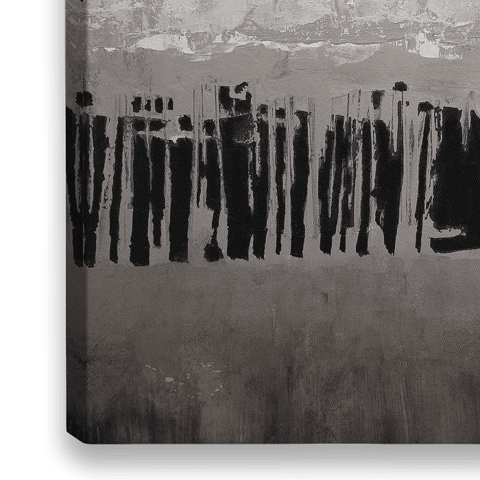Dit abstracte schilderij heeft een opvallend contrast tussen een licht bovengedeelte met textuur en een donker ondergedeelte, gescheiden door expressieve verticale zwarte strepen. Het bovenste gedeelte wordt gekenmerkt door zachte beige en gebroken witte tinten, gelaagd met subtiele texturen en delicate variaties in schaduw, die een…