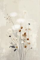 Een botanische compositie waarin fijne, haast transparante bloemen en zaadkoppen zich elegant uitstrekken tegen een zacht, neutrale achtergrond. Met ingetogen kleuren van crème, wit en warme bruin-tinten creëert dit werk een meditatieve, rustgevende sfeer die de vergankelijkheid van de natuur viert. De delicate lijnwerk en lichte…