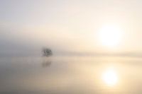 Nevel die opstijgt uit de IJssel tijdens een koude winterochtend in Nederland. Het waterpeil is hoog en er ligt sneeuw en ijs op de dijken aan de oever van de rivier tijdens deze prachtige ochtendzonsopgang.