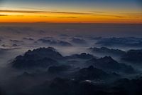 Nevel in de valleien van de Dolomieten bij zonsopgang, Italië. Luchtfoto