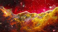 Geretoucheerde afbeelding. Elementen van deze afbeelding geleverd door NASA. Kunstwerk. Afbeelding van een nevel met opvallende gouden en gele formaties tegen een dieprode achtergrond. Verspreid door de nevel zijn talrijke sterren van verschillende helderheid te zien. De nevel heeft getextureerde, wolkachtige structuren.