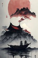 Een etherisch landschap met inkt waarin een donkere pagode op mistige bergtoppen staat. Een traditioneel schip glijdt door stille wateren onder een bloedende zon. Het vangt de serene, spookachtige schoonheid van oude folklore en het verstrijken van vergeten tijd.