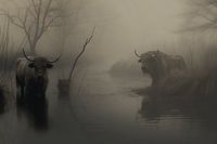 In dit schilderachtige tafereel, vastgelegd in het betoverende park Broekpolder in Vlaardingen, staan twee majestueuze Schotse hooglanders in het rustige water, omgeven door een grauwe mistige atmosfeer. Hun robuuste silhouetten doemen op als beschermers van het verstilde landschap, gehuld in een waas van mysterie. De rustige wateren weerspiegelen de serene sfeer, terwijl de grauwe mist de contouren van de natuurlijke pracht zachtjes vervaagt. Dit beeld, een harmonie tussen de kracht van de hooglanders en de rust van de natuur, belichaamt de rustieke schoonheid van het natuurgebied Midden Delfland.