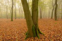 Uitzicht in een beukenbos op een mooie mistige ochtend in de herfst in het Speulderbos in het Veluwse natuurreservaat.