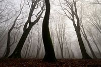 Beukenbos tijdens een mistige winterochtend met wat sneeuw op de bosbodem van het Speulderbos op de Veluwe. De bosgrond is bedekt met bruine afgevallen bladeren en het pad verdwijnt in de verte. De mist geeft het bos een desolate en mopperige sfeer.
