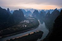 Een mistige zonsopkomst over de kalksteen rotsformaties nabij Xingping in China.