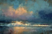Een abstract digitaal schilderij toont een sfeervol kustlandschap met zachte golven, pastelkleurige avondlucht en blauwe zee aan de horizon. Gedempte kleuren, getextureerde penseelstreken en zacht licht creëren een impressionistische sfeer vol rust en diepte. Het gouden licht van de avond wordt zachtjes gereflecteerd op het…