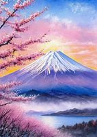 Dit abstracte oliepastel toont de berg Fuji bij zonsopgang, gehuld in zachte mist en omlijst door tere kersenbloesems. Schilderachtige mengingen lossen de berg op in vloeiende streken en roepen zowel grootsheid als sereniteit op. Spettertexturen drijven over het doek als verspreide bloemblaadjes en benadrukken beweging en kwetsbaarheid in de stilte. De atmosfeer straalt vernieuwing en stil ontzag uit, en transformeert het icoon van de natuur in een lyrische abstractie. Dit werk resoneert met mensen die waarde hechten aan vrede, schoonheid en tijdloze elegantie, waardoor het een opvallende aanvulling is op elke contemplatieve ruimte.