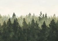 Aquarel van een dicht bos met dennenbomen, met een groen en grijs kleurenpalet, een mistige achtergrond, een neutraal kleurenschema, weinig details, een eenvoudig ontwerp, een minimalistische stijl, zachte randen, onscherpe details, een vlakke witte achtergrond, gedempte kleuren, laag contrast en geen schaduwen. Aquarel clipart.
