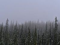 Landschapsopname van een dicht naaldbos met besneeuwde bomen in de late herfst, verdwijnend in de dichte begroeiing, in Jasper National Park in Alberta, Canada in de Rocky Mountains.