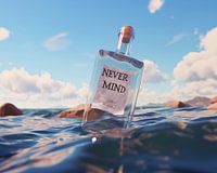 Een fles dobbert in de zee met een briefje waarop staat "never mind ".