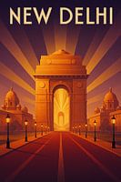 Deze New Delhi Art Deco poster viert de grootsheid en het ritme van de hoofdstad van India door de majestueuze India Gate, badend in gouden avondlicht. Stralen van amber en violet stralen over de skyline en benadrukken de koloniale architectuur die het hart van New Delhi definieert.