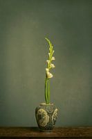 Stilleven met bloemen (witte gladiolen) in delftsblauwe vaas gemaakt in de studio met zacht licht.