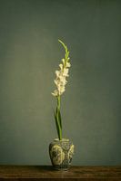 Stilleven met bloemen (witte gladiolen) in delftsblauwe vaas gemaakt in de studio met zacht licht.