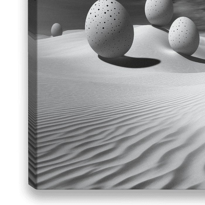 Surrealisme in zwart-wit fotografie stijl met gespikkelde eieren in de woestijn.
