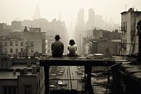 New York rond 1920. Twee mensen zitten op een dak en kijken uit over de drukte van de stad. Auto's staan geparkeerd op straat en mensen lopen rond. De skyline tekent zich af tegen de waas van de stad.