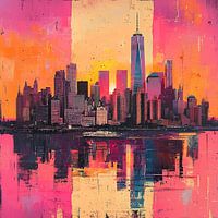 Het schilderij toont de skyline van New York in levendige, impressionistische kleuren. Torens en wolkenkrabbers rijzen op in dynamische streken van roze, zonnig geel en oranje. De stad lijkt te trillen van energie, gevangen in licht en kleur. De lucht gloeit in oranje en roze tinten, terwijl het water onderaan reflecties van gebouwen…