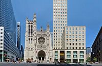 Met het Panorama zijn we in Midtown Manhattan, het middelste deel van het schiereiland. Hier staat de Saint Thomas Church, die in 1914 voortborduurde op de Franse gotiek in de stijl van het historisme. De architecten Ralph Adams Cram en Bertram Grosvenor Goodhue vervingen een door een aardbeving verwoeste kerk op dezelfde plaats. De Buchmann-toren, die deel uitmaakt van het ensemble, dateert van 1957 en loopt met drie verdiepingen af naar de straat. Zo ontstaat een tegenhanger van de Saint Thomas Church, die ook in zijn materialiteit, de kalkzandsteen, overeenkomt met de kerk. Deze beeldmontage uit New York City is tot stand gekomen uit verschillende opnamen met meerdere perspectieven. Meer informatie en het volledige panorama zijn te vinden in het archief op: https://panoramastreetline.com/fifth-avenue-midtown-manhattan-saint-thomas-church-new-york-usa-P16870