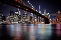 Tegen de verlichte achtergrond van Manhattan schittert de beroemdste brug van New York met zijn verlichte hangkabels. De vele lichtjes van de wolkenkrabbers worden in regenboogkleuren weerkaatst in de East River. Een prachtig gezicht dat bijna surrealistisch lijkt.