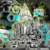 Een moderne en decoratieve compositie met geometrische figuren. Hier zijn twee typische uitzichten uit New York City. Een straatbeeld van 5th Avenue en een nachtbeeld van Times Square.