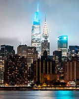 De foto toont het uitzicht vanuit Long Island City over de East River naar Manhattan met de beroemde skyline van de East Side. In het midden van deze opname rijst het legendarische Chrysler Building op met zijn iconische torenspits die schittert in gouden licht. De fonkelende lichtjes van de stad worden weerspiegeld in het kalme water…