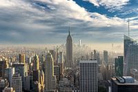 Gezicht op Lower Manhattan (New York) tijdens een mistige middag. Enkele minuten voordat de foto werd genomen, was er een sterke storm over de stad uitgebroken. Toen de storm aan het begin van de middag afzwakte, bleef er een mistige atmosfeer over die het warme licht van de avond weerspiegelde. Het Empire State Building en andere…