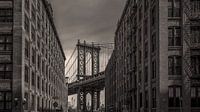 Iconisch beeld van de Manhattan Bridge, gezien vanuit Washington Street in Brooklyn, met blik op het Empire State building in de verte.