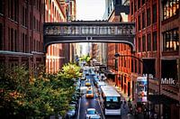 Een mooi straatbeeld met een klassieke skybridge als voetgangersbrug tussen beide zijden van de straat en de gebouwen. Op straat ziet u de typische gele taxi's "Yellow Cabs" van New York.