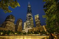 das One World Trade Center im Abendlicht , im Vordergrund der Süd Pool wo der Südturm des WTC stand.