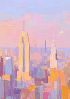 Dit impressionistische olieverfschilderij toont de skyline van New York City vanuit vogelperspectief op het Empire State Building. Pastelkleuren van roze, paars en geel omlijsten zacht de gebouwen, terwijl de lucht helder is en zonnestralen de scène verlichten. De minimalistische compositie maakt gebruik van eenvoudige, zichtbare…
