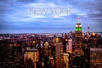 New York tekst boven de skyline van New York. De foto is gemaakt tegen de warmte van de avond vanaf het mooiste uitzicht van NY: Rockefeller center. Het iconische Empire State building en rechtsachter ook het nieuwe One World Trade Center torenen boven de stad uit.